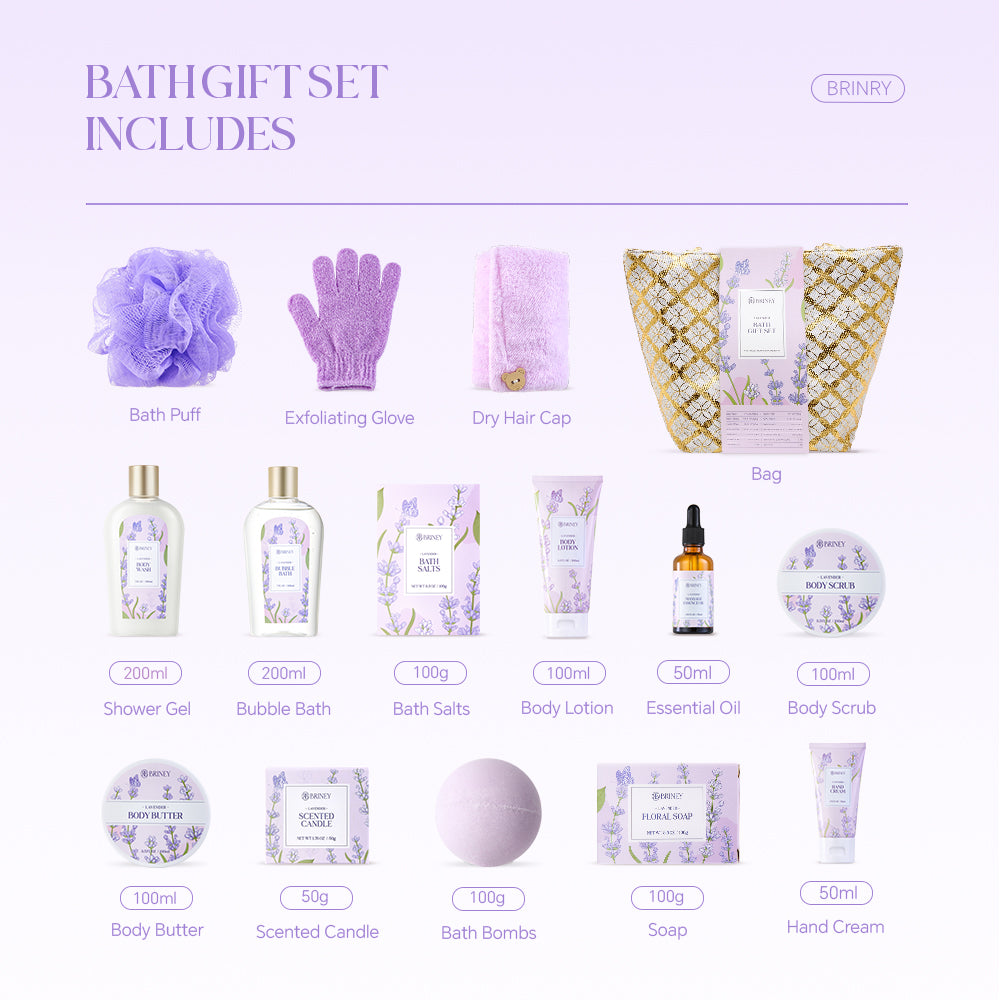 15 Pcs Package Content | 1 x Body Wash (200ml), 1 x Bubble Bath (200ml), 1 x Body Lotion (100ml), 1 x Body Scrub (100ml), 1 x Hand Cream (50ml), 1 x Bath Bomb (100g), 1 x Body Butter (100ml), 1 x Massage Essence Oil (50ml), 1 x Bath Salt (100g), 1 x Scented Candle (50g), |