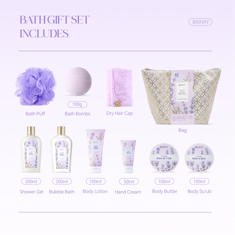 10 Pcs Package Content | 1 x Body Wash (200ml), 1 x Bubble Bath (200ml), 1 x Body Lotion (100ml), 1 x Body Scrub (100ml), 1 x Hand Cream (50ml), 1 x Bath Bomb (100g), 1 x Body Butter (100ml), 1 x Hair Turban Towel, 1 x Shower Pouf, 1 x Storage Tote Bag |